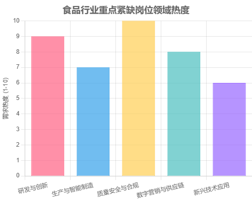 从上图可以看出,质量安全与合规领域的人才需求热度最高,这与日益严格的法规要求和消费者对食品安全的高度关注密切相关。研发与创新作为企业发展的核心动力,以及数字营销与供应链在新零售时代的快速发展,也显示出极高的人才需求。生产与智能制造领域随着技术升级,对新型技术人才的需求持续存在。新兴技术应用(如AI、大数据)虽然目前体量相对较小,但其增长潜力和未来重要性不容忽视。