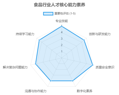 该雷达图清晰地展示了食品行业对人才核心能力素养的综合要求。专业技能和质量安全意识是基石,其重要性不言而喻。同时,创新与研发能力、持续学习能力对于适应行业快速发展和技术迭代至关重要。在数字化时代,数字化素养成为必备技能。而沟通与协作能力以及解决复杂问题能力则是确保个人和团队高效工作的关键软实力。