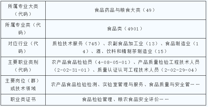 为适应科技发展、技术进步对行业生产、建设、管理、服务等领域带来的新变化,顺应食品制造、食品质检技术服务等行业数字化、网络化、智能化发展的新趋势,对接新产业、新业态、新模式下农产品食品质量检验检测、实验室管理与服务、食品质量与安全管理等岗位(群)的新要求,不断满足质检技术服务、农副食品加工、食品制造、酿造食品制造行业高质量发展对高素质技能人才的需求,推动职业教育专业升级和数字化改造,提高人才培养质量。