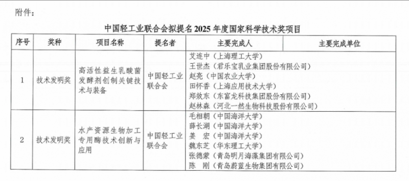 中国轻工业联合会提名2025年度国家科学技术奖项目(8个)。